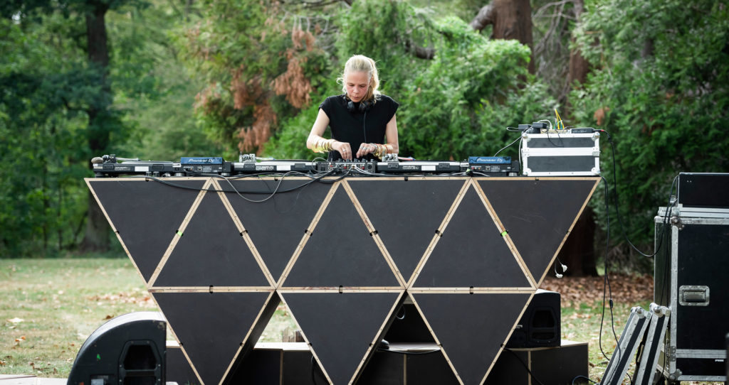​Die modulare Bühnenskulptur Structure von Julia Bünnagel dient als Plattform für einen dreistündigen akustischen Trip im Lantz’sche Park. (Structure wurde gefördert von der Kunststiftung NRW)